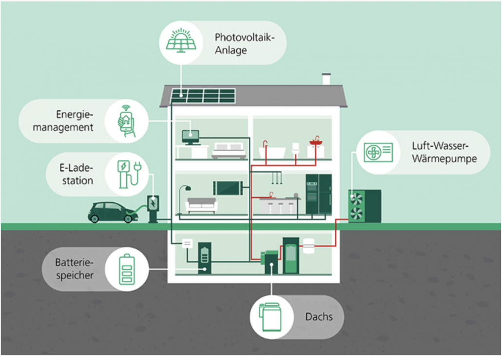 Mit dem beim Heizen produzierten Dachs-Strom wird Ihr Gebäude versorgt und z.B. eine Wärmepumpe angetrieben, Überschüsse werden gegen Vergütung ins Netz geliefert oder zur späteren Nutzung eingespeichert. Wird noch zusätzlicher Strom benötigt, kann auch eine PV-Anlage integriert werden und den übrigen Reststrom beziehen Sie mit dynamischen Tarifen günstig aus dem Netz.